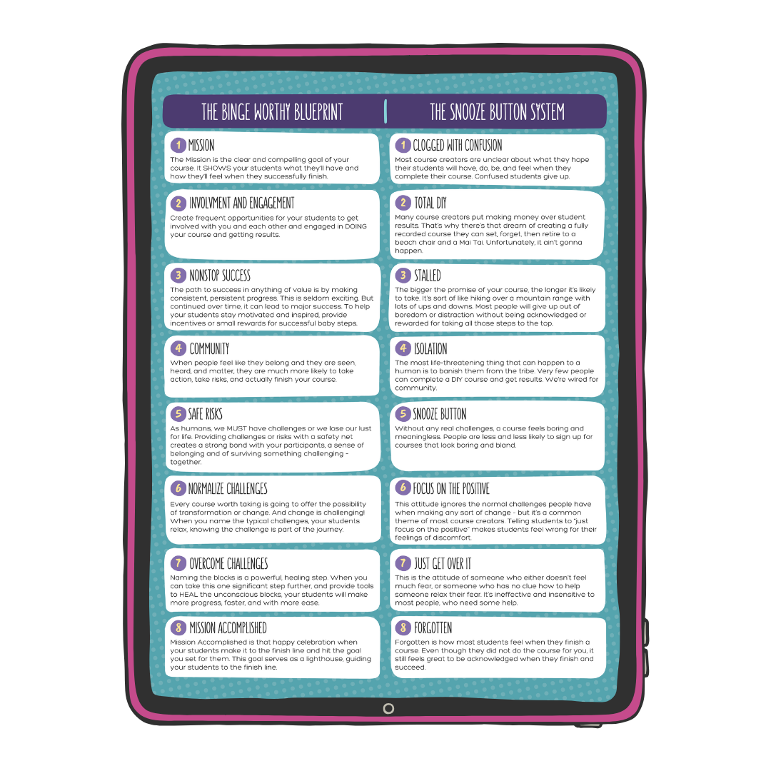 • 8 step Binge Worthy Blueprint for creating your next course.